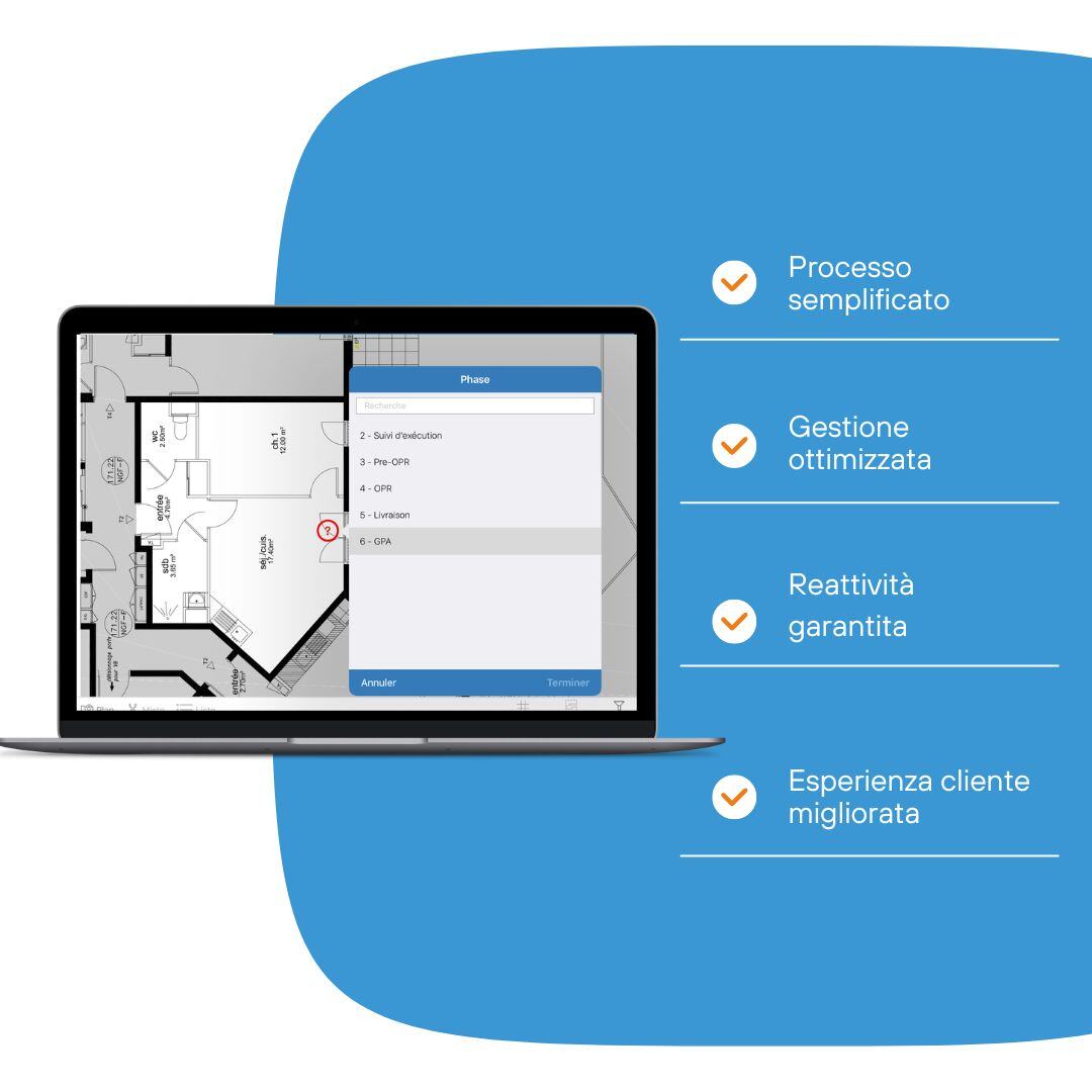 Una soluzione adatta alle esigenze di tutti gli attori per l’intera durata dei lavori e della garanzia, consentendo una collaborazione fluida e efficace in tempo reale. I dati sono archiviati su cloud in modo strutturato e sicuro; smartphone e tablet sono sincronizzati al cloud per poter lavorare dove vuoi e quando vuoi.